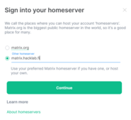 Halutessasi voit käyttää minkä tahansa matrix palvelimen tunnuksia liittyessäsi hacklabin pikaviestinkanaville. Suositus on kuitenkin käyttää jäsenrekisterin @tunnus:hacklab.fi tunnuksia (kertakirjautuminen, SSO/Keycloak).