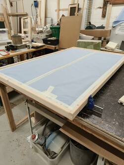 Next the speedcloth was stretched and stapled around the backside of the board. I should've paid more attention here. Once the table was ready, the fabric was still a little bit loose and not fully tight as you would wish. I covered the fabrics with paper and tape to protect them from sanding dust and wood dye + lacquer.