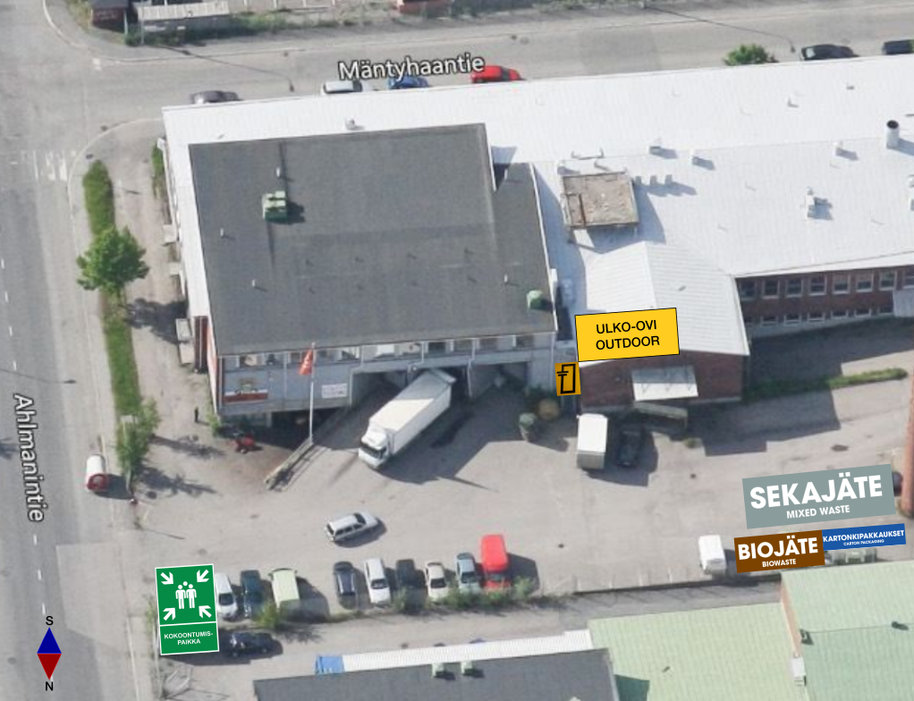 - Bio waste (biojäte): To a biowaste bin in the parking area, next to the waste compactor. Take away the smelly food scraps etc. immediately. Please. Please. Please.