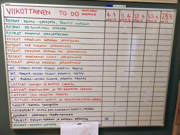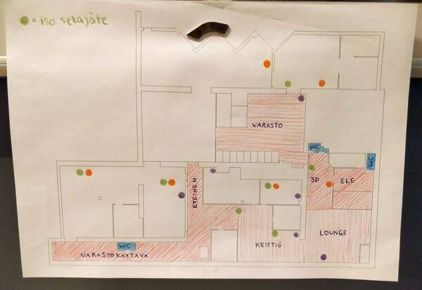 - Tiloissa ei käy siivoojaa tai muutakaan palkattua henkilökuntaa. Tilojen yllä- ja puhtaanapito on siis kaikkien käyttäjien vastuulla. Siivoa käytöstäsi aiheutunut sotku välittömästi käytön jälkeen. Palauta työkalut käytön jälkeen omille paikoilleen. Roskisten täyttyessä vie roskapussi ulkona olevaan jätepuristimeen. Siivoa keittiö käytön jälkeen ja laita tiskit tiskikoneeseen. Mikäli sinulla on joutenaikaa, siivoa yleistiloja vaikket olisi sotkenutkaan.