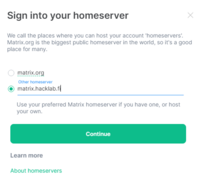 - Valitse ja kirjoita palvelimen osoite “Muu kotipalvelin”/“Other homeserver” kenttään matrix.hacklab.fi