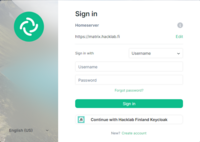 Hacklab.fi-kattojärjestö ylläpitää Matrix-palvelinta, johon pystyt kirjautumaan jäsenrekisterin tunnuksilla (SSO/Keycloak).