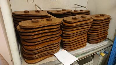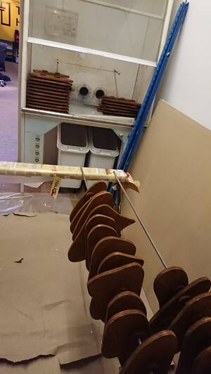 Fusionin avulla päästiin sitten helpommin suunnittelemaan penkin tekemistä käytännössä. Arno teki muotoon vielä viimeisiä muutoksia, jotta penkki olisi edes mahdollista valmistaa. Esim. penkin ylä- ja ala-osa tuli olla yhtenäinen, jotta kierretanko peittyisi kokonaan vanerin sisälle. Päätettiin käyttää M12 kierretankoa puristamaan levyt yhteen. Jokaiseen levyyn tuli neljä reikää, jokaiselle kierretangolle, ja samaan kohtaan liimattiin ympyrän muotoiset palat, joita vasten levyt puristuivat.
