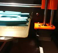 - Jos mahdollista, vältä kappaleiden laittamista reunoille. Vieressä näkyy alustan lämpöjakautuma, josta huomaa, että reunat ovat hiaman viileämpiä. Tämä johtaa siihen, että ABS kutistuu liikaa ennen valmistumista ja saattaa tästä johtuen irrota tasosta ( kuten alla olevassa kuvassa näkyy).