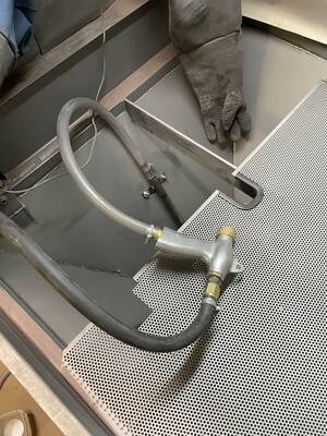 Olet nyt valmis hiekkapuhaltamaan työstettävän kappaleesi. Avaa puhalluskaapin luukku, laita kappale sisäään ja suuntaa sitä puhalluspistoolilla. Puhallusta ohjataan kaapin edessä lattialla olevan jalkapolkimen avulla.