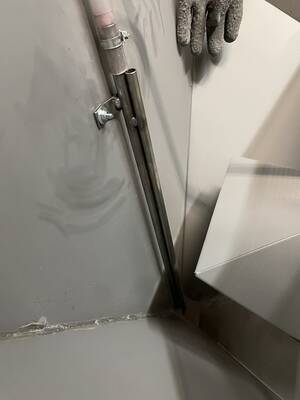 - Tarkasta, ettei sifooniputki ole tukossa. Voit asettaa suojatun käden puhallispistoolin suuttimen eteen tiivisti ja päästää pistoolista ilmaa läpi jalkakytkimellä. Tämä ohjaa paineistetun ilman sifooniputkeen ja tyhjentää tämän mahdollisesta tukoksesta.