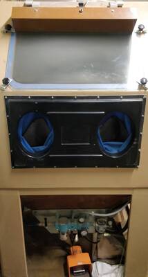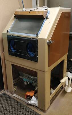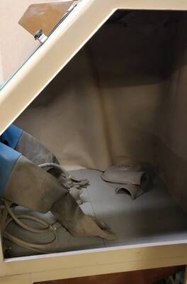 Hacklabilta löytyy iso hiekkapuhalliskaappi erilaisten kappaleiden hiekkapuhallukseen. Kaappi toimii paineilmalla, jonka lisäksi valo ja suodatinimuri toimivat sähköllä.