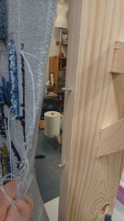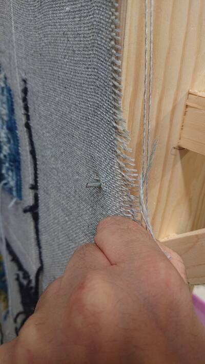 Kiristä kangas kehykseen mahdollisimman kireälle. Tarkastele kuitenkin, ettei kangas ole venynyt epätasaisesti, sillä tällöin tuftattu kuvio muuttaa muotoaan venytyksen lauettua.